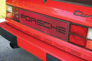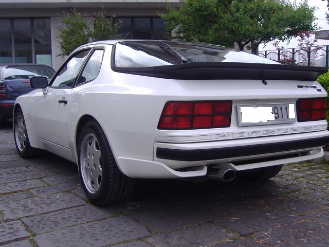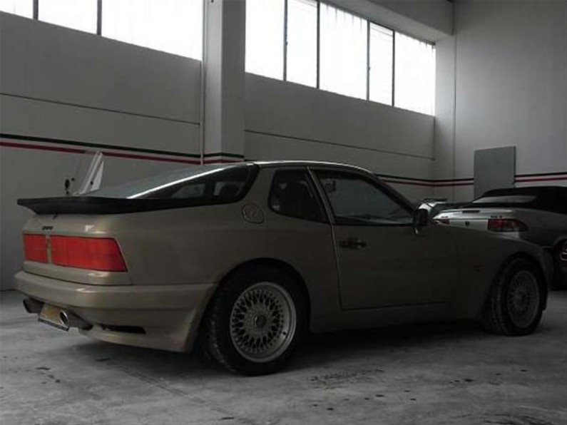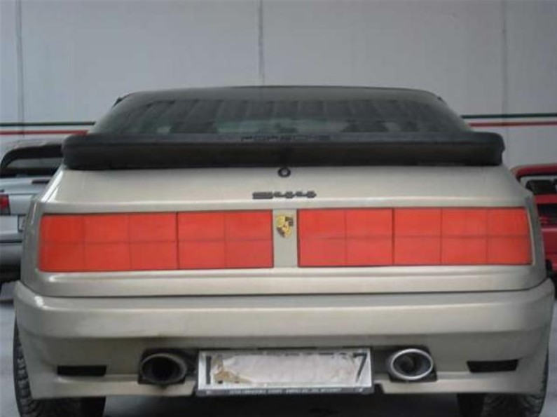 Notare il doppio scarico FINTO (un terminale è nero di fumo e l'altro lucidissimo). Ricordo benissimo che negli anni '80-'90 era in vendita per la 924/944 una scritta Porsche nera su vetro rosso (illuminabile!) che collegava i gruppi ottici posteriori tipo quella presente sulle 911 La targa veniva spostata sotto il paraurti come in questo caso. La modifica era molto in voga anche sulle Golf GTi