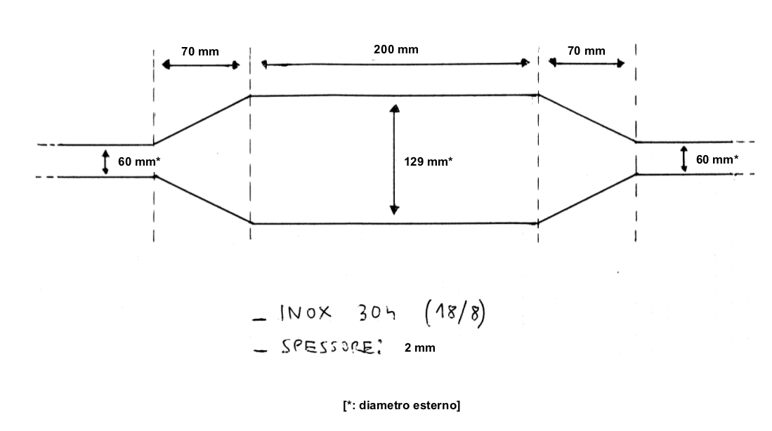 La forma e il dimensionamento sono state calcolate da me sia considerando i tubi standard che usa l'officina da cui mi servo sia in base a vari esperimenti postati su altri forum. Se sei interessato ad approfondire l'argomento qui c'è qualche link: