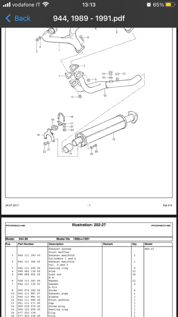È possibile che la mia 944 s2 del 1989 non abbia catalizzatore centrale (come quello nell foto del post di Lorenzo del 2017) ma solo un silenziatore? Alla vista il mio è diverso da quello che aveva Lorenzo. Andando a cercare sul listino ricambi , a pagina 151 trovo questo che vi posto, segnato come silenziatore per motore M44.41 (quello della mia s2) che alla vista è uguale a quello che ho montato io. Se così fosse quindi il silenziatore centrale per 944S della Dansk che ho linkato sopra sarebbe perfetto, giusto?
