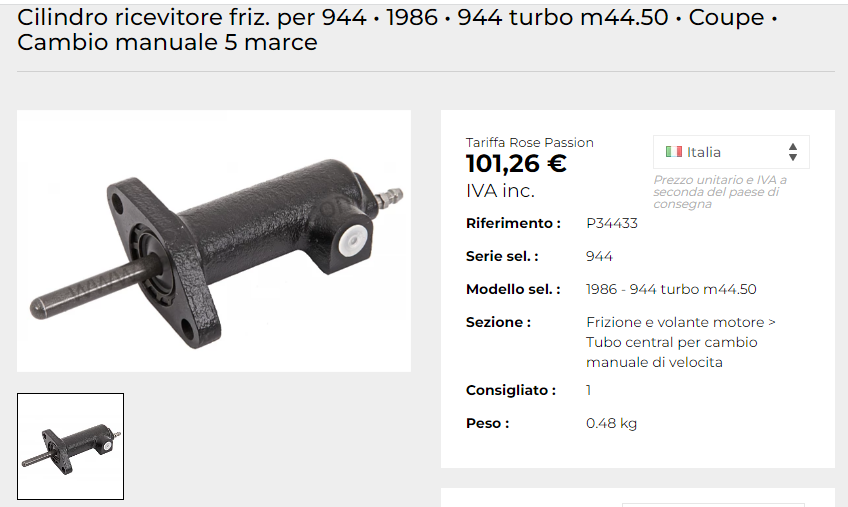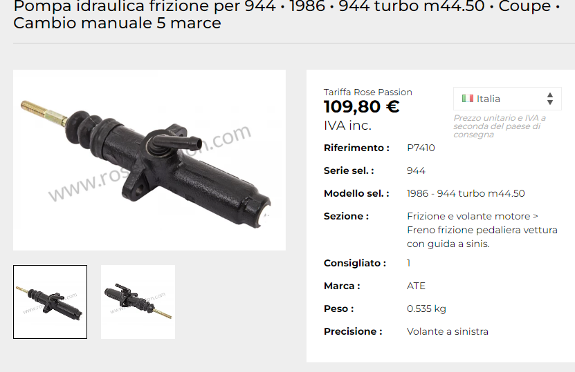 Grazie ragazzi per le info... Lo slave cylinder equivale alla pompa idraulica? La scocciatura è che il mio meccanico di fiducia è in ferie fino al 1 settembre e non so a chi portarla.... il lavoro è considerato di difficile impiego oppure equivale ad un togli e metti? il pezzo dovrebbe essere questo.. http://www.rosepassion.com/it/cat/porsche-944-1986-944-turbo-m44-50-coupe-cambio -manuale-5-marce/M434/frizione-e-volante-motore/frizione/B125/freno-frizione-ped aliera-vettura-con-guida-a-sinis/I260/pompa-idraulica-frizione/P7410 |