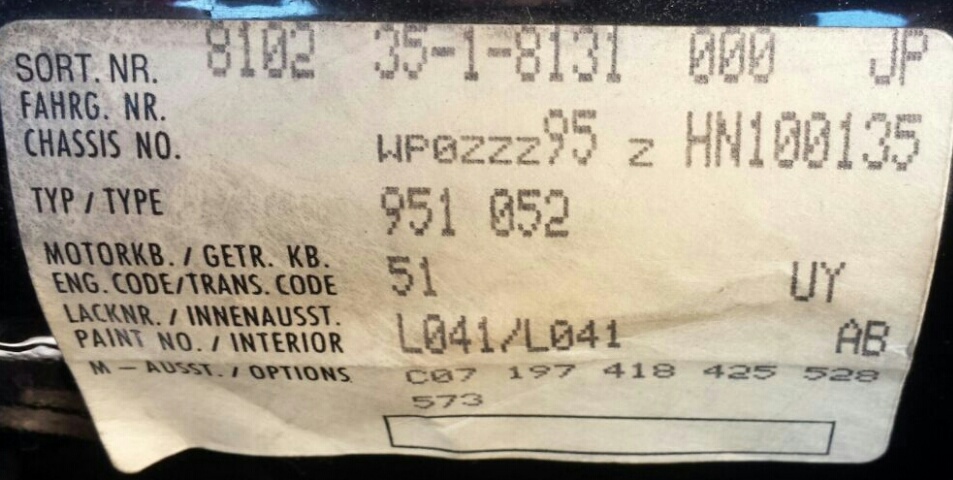 Salve sto valutando l'acquisto di una 944 turbo dell' 87. Mi sono fatto inviare la foto della targhetta del vano bagagli e cercavo di orientarmici tramite la tabella presente nella sezione dedicata alla 944 turbo dove indica i vari codici motore ecc.ecc. Ma onestamente non mi ci ritrovo... qualcuno mi sa far un po di luce tra tutte quelle sigle? Grazie!!! |