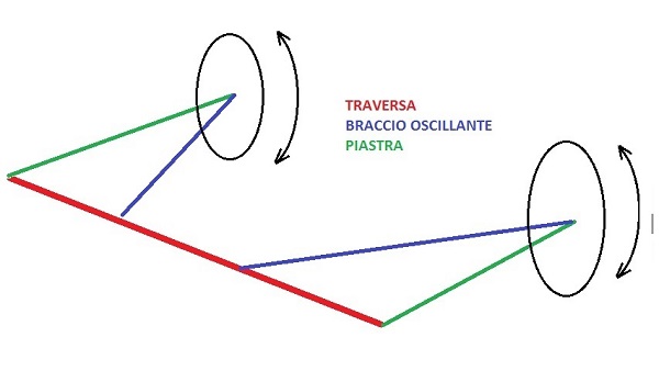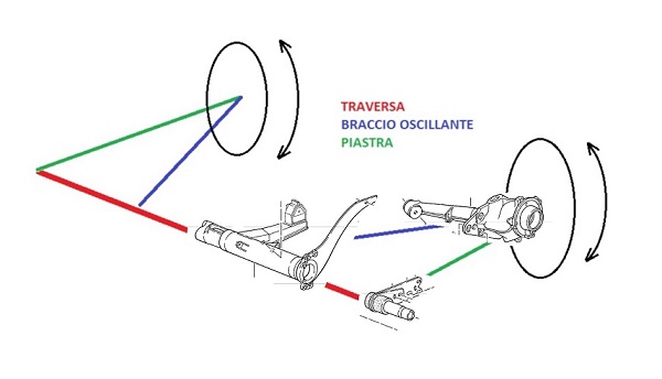 Cominciamo dalla teoria. La sopensione della 944 è un triangolo con un lato fisso (la TRAVERSA) fissata al telaio e due lati mobili il BRACCIO OSCILLANTE e la PIASTRA o MONTANTE POSTERIORE (se gualche guru avesse delle traduzioni più accurate del nome di questi componenti batta un colpo) Il tutto funziona così: