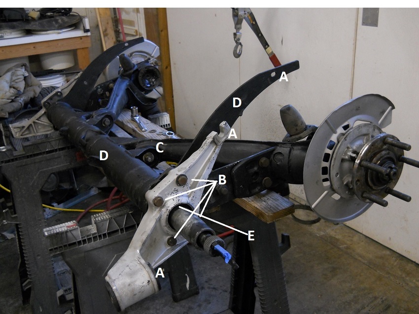 B) le 4 viti di fissaggio della flangia di supporto alla traversa. Io avevo una rondella rotta che cigolava C) lo snodo del braccio oscillante D) i punti dove la traversa sfiora lo chassis. Qui basta poco per innescare vibrazioni forti E) ovviamente i silent block della barra di torsione. Ma per questo è necessario sfilare la flangia e in pratica accedere alla barra di torsione |