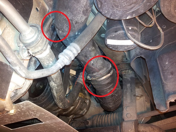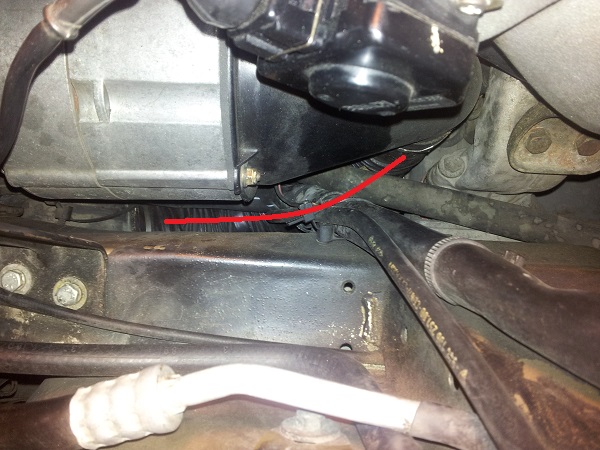 Ora passando sotto la macchina puoi vedere in rosso due punti di attacco. La fascetta verso il soffietto e una vite che fissa l'asola