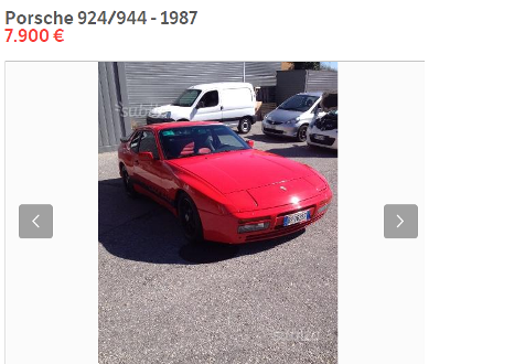 Christian, la turbo america grigia a 14k non pare malvagia. Per il resto su subito (meno affidabile di AS lo so) ne erano spuntate alcune http://www.subito.it/auto/porsche-944-turbo-potenza-182840687.htm http://www.subito.it/auto/porsche-944-turbo-1985-grigio-met-caltanissetta-180598425.htm Per la rossa di cui si diceva sopra a 9k pasticciata qualcuno ha parlato col proprietario ed è venuto fuori che il colore originale era un altro. Comunque è andata