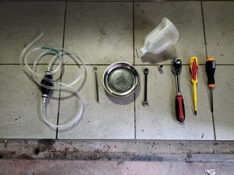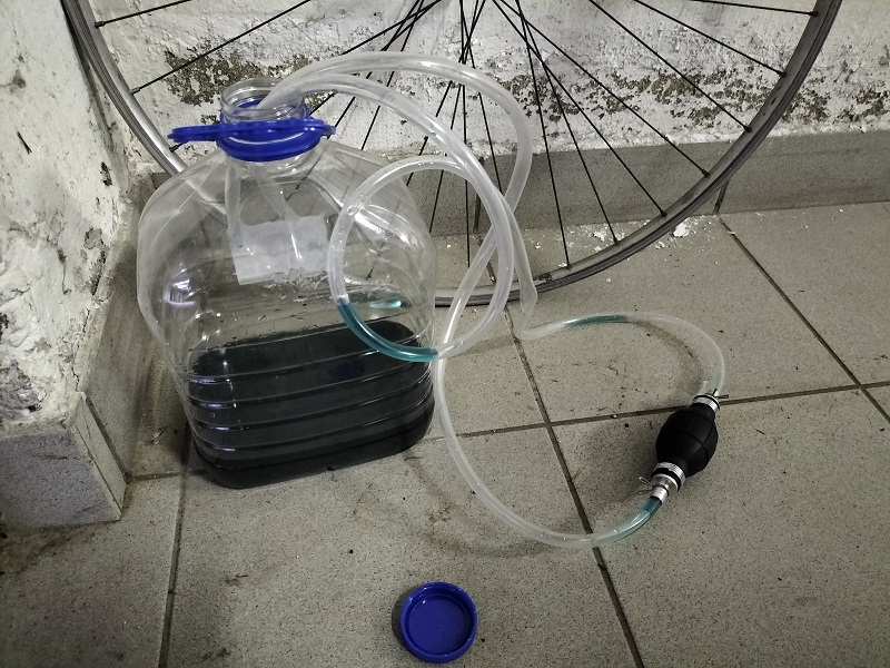 Usando la pompa, si estragga quanto più liquido possibile dalla vaschetta. Siccome all'interno della vaschetta ci sono molte paratie, il consiglio è, rimosso la maggior parte del liquido, di inclinarla in modo da portare il liquido in alto a sinistra e continuare ad aspirarlo.