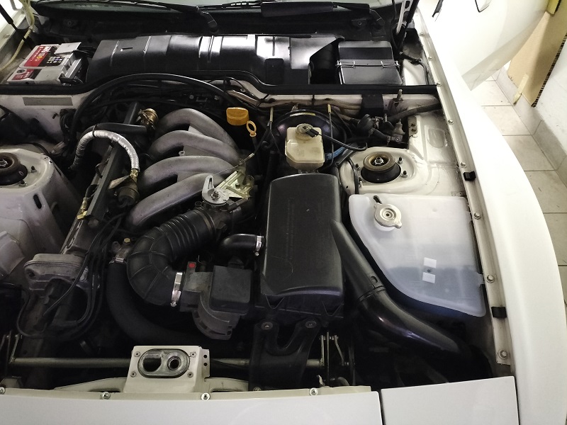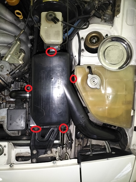 TEMPO RICHIESTO: 1,25 ora DIFFICOLTA': semplice PARTI NECESSARIE Vaschetta di compensazione: 944 106 125 06 (attenzione la 944 Turbo ha un codice diverso. Verificare il codice corretto per la propria auto) COSTO Vaschetta di compensazione, originale Porsche: 234 € Pompa aspira liquidi: 7 € circa su Amazon VEICOLI DI PERTINENZA PER LA PROCEDURA: 944 aspirata 163 CV. Con minime variazioni la procedura si applica anche alle altre versioni ATTENZIONE: il lavoro deve essere eseguito a motore FREDDO ESECUZIONE Se si desidera sostituire il liquido antigelo si proceda prima allo svuotamento dell'impianto. Nel forum ho fatto un thread sull'argomento.4 Nel mio caso, essendo il liquido recente, ho iniziato subito con il lavoro di sostituzione della vaschetta. Rimuovere il coperchio dell'airbox, svitando le viti evidenziate in foto) e il filtro dell'aria (può essere una buona occasione per sostituirlo)