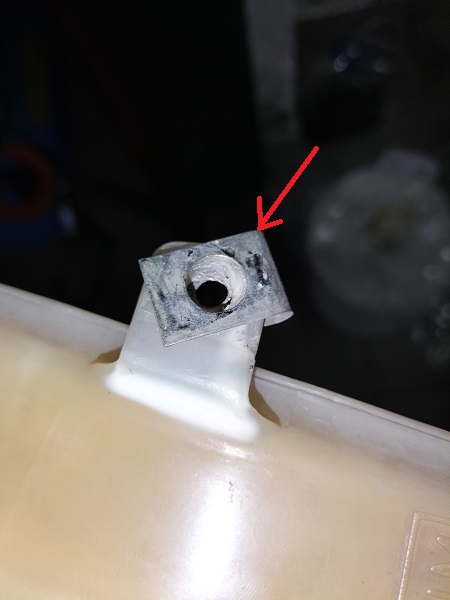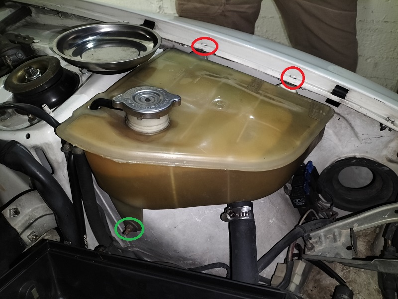 Rimuovere, con la bussola da 10mm e la chiave da 10mm le tre viti che tengono fissata la vaschetta all'auto. ATTENZIONE: la vite evidenziata in verde potrebbe essere ossidata. Si presti attenzione a non forzarla per non rischiare di "stappare" il perno filettato dalla carrozzeria.
