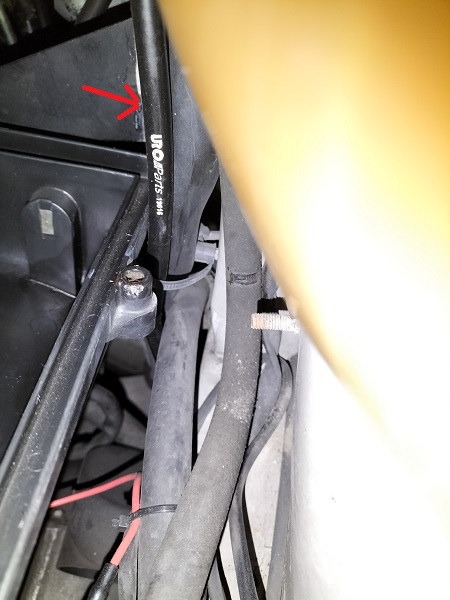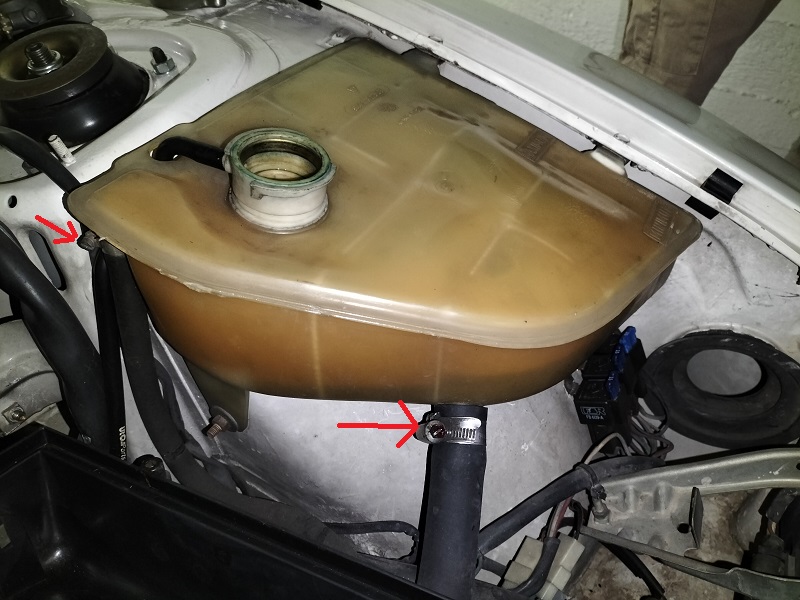 Si allentino le due fascette evidenziate e si rimuovano i tubi. Da quello inferiore e dalla vaschetta stessa potrebbe uscire un po' di liquido. Si utilizzi una bacinella per raccoglierlo. Questo liquido potrebbe contenere delle impurità, nel qual caso, lo si elimini nel modo appropriato.