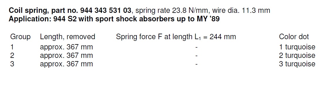 In un altro thread http://www.porschemania.it/discus/messages/6/745023.html?1445328089 Roberto (Gnoppo) evidenziava che per la S2 i bollini turchesi erano per le molle sportive M474 da 367 mm e, in effetti, la mia macchina è bassina ma non ha l'opzione M474, come si vede dalla targhetta codici