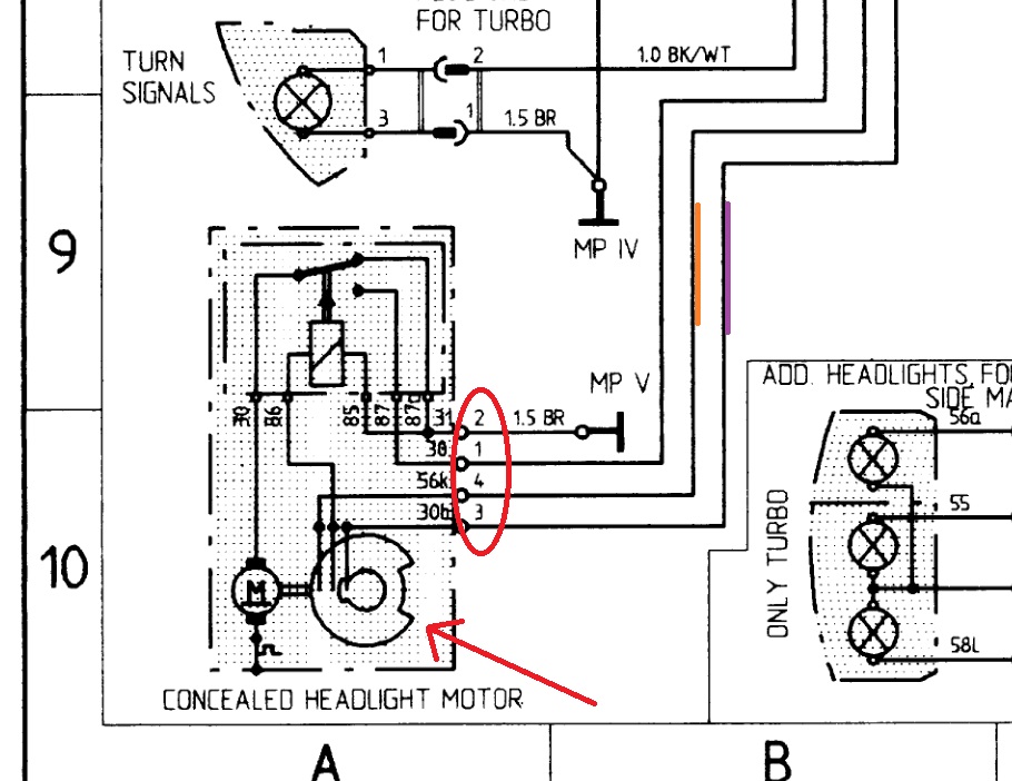 Allora sullo schema ho cerchiato i contatti in ingresso nel gruppo motore dei fari, partendo dall'alto il n°2 è la massa, il n°1 è il positivo (+12v) il 4 e il 3 sono i due segnali di controllo che arrivano dalla manopola in parte al volante. Sul motore c'è un disco con la forma di quello indicato dalla freccia nello schema, questo disco è solidale all'albero del motore e quindi quando il motore gira anche il disco lo fa. Come vedi sul disco arrivano tre spazzole, quella al centro è sempre a contatto con il disco ed è quella che se alimentata eccita il relay, le altre due vengono alimentate dalla manopola in parte al volante, esse sono negate l'una rispetto all'altra ovvero quando una è a livello alto (12v) l'altra non viene alimentata, quando la spazzola non fa più contatto (per via della forma del disco) il motore si ferma. Questo è il principio di funzionamento. Per verificare il motore basta scollegare il connettore e alimentarlo manualmente, i colori dei cavi sono: marrone -> massa, rosso/blu -> +12v, giallo/blu -> controllo, rosso/verde -> controllo. Se non è il motore il problema può essere la manopola alla sinistra del volante, anche qui sarebbe da aprire e verificare che sia tutto in ordine (contatti puliti e senza qualche elemento esterno che provochi dei cortocircuiti) (Messaggio modificato da maniron il 10 settembre 2015) Un buon maestro non si dimentica di essere anche un buon allievo.