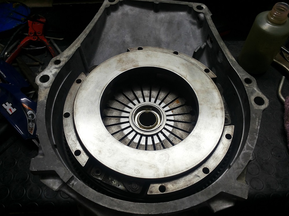 l'assemblaggio campana volano spingidisco. nessun meccanico avrebbe avuto la voglia di pulire tutto ben bene e lubrificare forchette e cuscinetto reggispinta. l importanza di farsi le cose in garage con calma è essenziale per un appassionato. se poi avete un amico meccanico che vi da le dritte giuste come ho avuto la gran fortuna di avere io, siete a cavallo