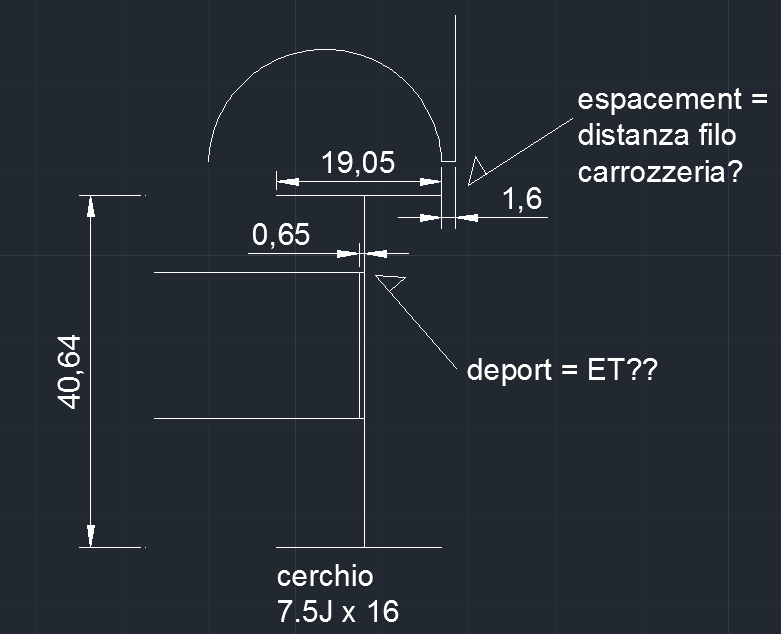 come al solito... ci fosse una cosa che mi è chiara! allora... fichissimo il prospetto che mi hai mandato claudio, non capisco bene cosa siano le distanze espacement e deport, o per lo meno lo ipotizzo... deport è l'et??? l'espacement? la distanza del filo carrozzeria? ho fatto uno schema d'espemio per un cerchio 7.5Jx16 è giusto lo schema?  |