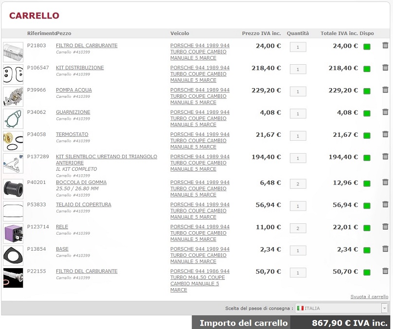 Le boccole dei trapezi sono ok ma prima verificherei per bene lo stato attuale, io per esempio non le ho cambiate ancora. Invece darei un occhio alle testine di sterzo sia dalla parte asta che dalla parte triangolo, questo è un difetto ben noto sulle 944. Esiste un kit di rebuild intorno ai 100euro. Per il resto secondo me non hai messo nella lista per la distribuzione alcuni cuscinetti...e anelli di tenuta vari p70914 p68445 p68433 p68434 e il termostato turbo p39988 magari fai vedere la nuova lista anche a Massimo perchè era una che avevo preparato per un amico e non ricordo se aveva problemi particolari inoltre immagino tu abbia già fatto olio e filtro (se non lo hai fatto ti consiglio Sheel Helix 10w-60...ormai un must per chi la usa allegramente ma anche in "turistico" va molto bene). in aggiunta prenderei anche le candele...per me ottime le ngk BP6ET Nell'occasione guarda come sono messa bobina, cavi, rotore e statore...nel caso cambiare! poi penserei all'olio differenziale (2litri di motul 75w-140 per diff limited slip) poi penserei a fare un check a tutti i tubi del vuoto...trovi la procedura nel mio 3d. poi...vabbè per adesso mi sembra sufficiente! www.super-lap.com --> Mettiti alla prova con i nostri corsi! www.ring-speed-motorsport.com --> noleggio al Nurburgring devo aggiungere altro?