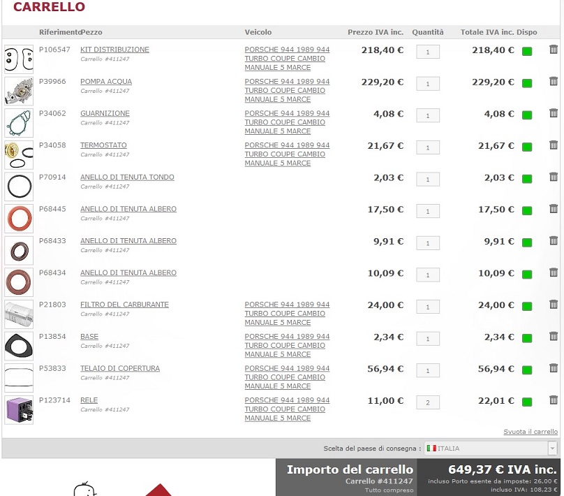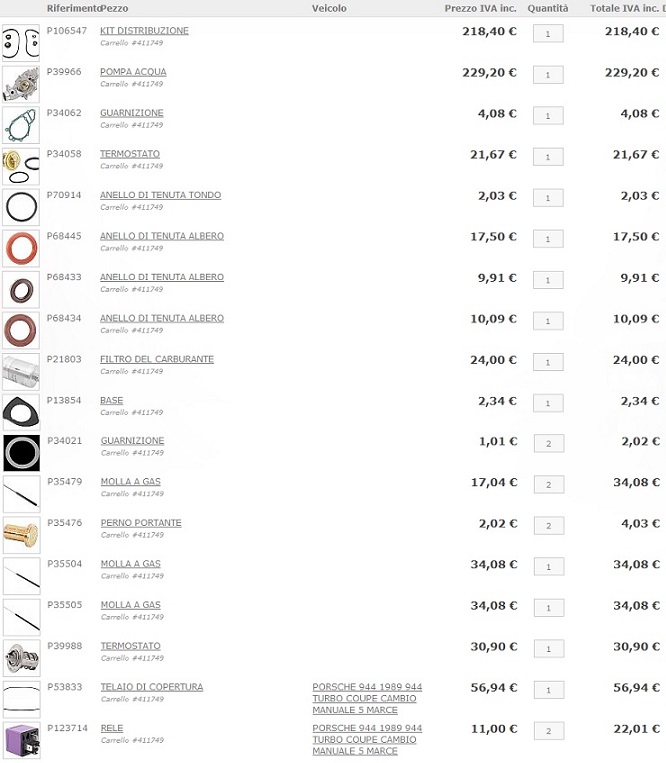 Ciao mirko, questi sono i tre fornitori ai quali mi sono rivolto principalmente per i pezzi di ricambio: http://www.944online.com/cgi-bin/ASI_Store.cgi?Dept+944turbo http://www.rosepassion.com/it/cat/porsche-944-1988-944-turbo-s-coupe-cambio-manu ale-5-marce/M444 http://www.lindseyracing.com/LR/Parts/944.html Trovi tutto qui e puoi comparare i prezzi (considera sempre a parte il trasporto, la dogana ) Ho visto rose passion per la guarnizione del paraberzza e mi sembra quella (perchè la cambi, è crepata?) ti ho consigliato il cambio delle boccole in gomma della barra di torsione anteriore e i silent block dei triangoli,vista l'anzianità dell'auto e considerando che le parti in gomma si seccano e si rompono, ma tu hai messo l'auto sul ponte per un ispezione ? hai visto come sono ridotti? magari erano già stati sostituiti.... Eviterei l'acquisto del filtro benzina del serbatoio: basta pulirlo delicatamente e soffiarlo, perchè la retina di plastica è molto sottile e delicata. a meno che non sia già rotta.... Sul discorso dell'affidabilità: non conoscendo le condizioni di determinati componenti, non si può valutare. Procedi per gradi: se si manifestano problemi, azzeccata la diagnosi risolvi quelli, le priorità le stabilirà la macchina stessa quando comincerai ad usarla "seriamente". Poi se ti fai contagiare dal morbo come me, e vorrai upgradare affronta sempre un impianto alla volta e rifallo tutto, non un pezzo alla volta. Altri lavori sono poi cosequenziali: fatto una cosa, va aggiornata anche quella che concorre alla stessa funzione.... se vuoi potresti non finire mai |