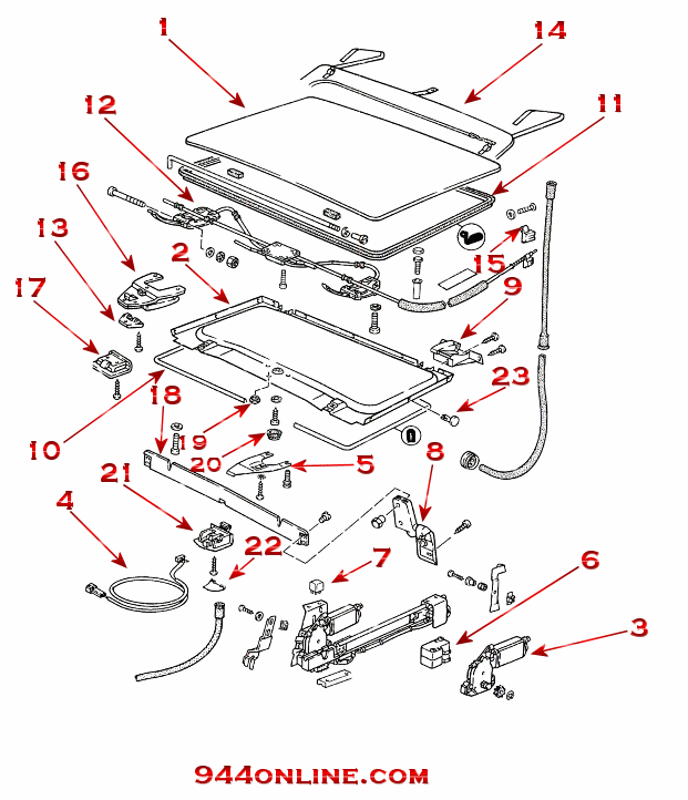 Nella speranza di aiutari ho girovagato un po, ma ho trovato solo risoluzioni ai problemi elettrici del tettuccio e nessun video esplicativo sul tubo inerenti la sostituzione delle guarnizioni. Ti invio comunque uno schema e un sito con tutte le soluzioni alle varie problematiche che potranno verificarsi in futuro. non avendo il tettuccio sulla mia non riesco per ora a fare di più http://only944.com/repairguides/