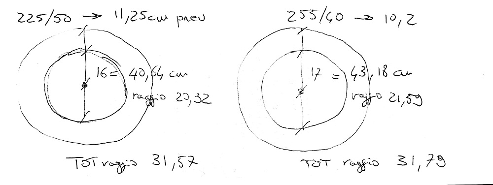 A destra cerchio che monto io 255/40R17 Quindi l'altezza del pneumatico si calcola come: 255*40/100=10,2cm Il cerchio è da 17 pollici quindi il raggio del cerchio è: 17/2*2,54=21,59cm TOTALE RAGGIO 31,79cm