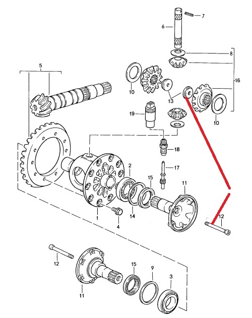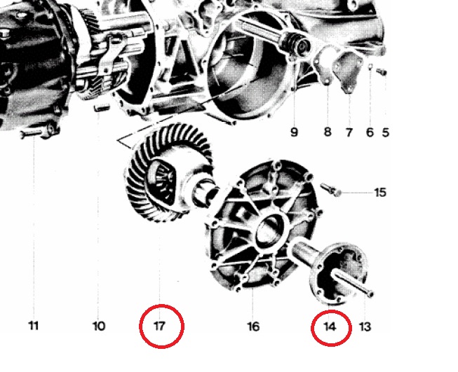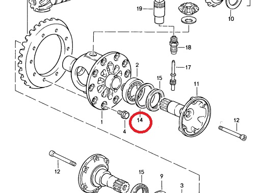 Allora ragazzi. Chiudo il thread sperando che un domani qualcuno con lo stesso sintomo legga Porschemania e si eviti giornate di ricerche. Avevo appurato che il mozzo, infilandosi nel differenziale, aveva del gioco che generava il rumore che si nota nel video. L'anello di spessore (14) non c'entrava niente. L'ho fatto arrivare da mamma Porsche, ma non sono riuscito a capirne l'utilizzo (anche dopo approfondite letture del "Workshop manual") |