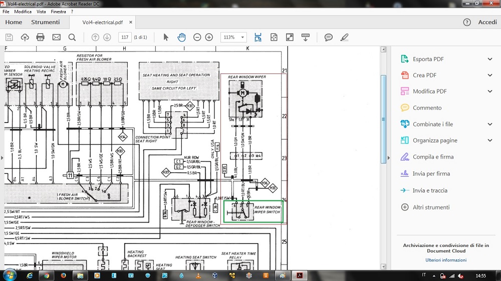 Ciao a tutti, domenica scorsa, uscito con la Bianca in un pomeriggio estivo, mi sono ritrovato sotto un temporale violentissimo con grandine (il rosario è stato tutto snocciolato mentre correvo al parcheggio per metterla in un sotterraneo) e mi sono accorto che il tergilunotto non funzionava più (a maggio, sotto un altro acquazzone, invece funzionava). Altro rosario e inizio delle indagini. Per prima cosa ho rimosso il copri motorino mettendo a vista motorino e contatti elettrici. Ci sono tre fili: marrone, verde e verde/nero, Secondo lo schema elettrico -che vedremo dopo- il marrone è la terra, il verde è un +12V fisso sotto chiave (serve per riportare il tergi in posizione di riposo quando si spegne l'interruttore, il verde/nero è un +12V comandato dall'interruttore. Primo controllo: tester alla mano ho controllato i voltaggi tra i vari cavi. marrone-verde: +13,6V ok marrone-verde/nero: tensioni variabili da 0,5V a 1,2V. NON OK. Siccome il lavoro l'ho fatto a rate, me ne sono andato a cena sperando che non fosse andato in corto il motorino o qualcos'altro. Chiedo a Roberto (gnoppo) di dirmi le tensioni sul suo motorino e mi conferma che anche tra marrone e verde/nero dovrebbero esserci 12V quando l'interruttore è su ON. Secondo controllo: stesse misure senza carico (fili staccati). Ottengo un +12V su entrambe le coppie. La cosa mi manda in sbattita perché comincio a pensare di dover smontare tutto il meccanismo e aprire il motorino. Tuttavia faccio un altro controllo: con un morsetto e un filo porto il +12V dal verde al terminale del verde/nero (scollegato) e vedo, con enorme sollievo, che il motorino va perfettamente.