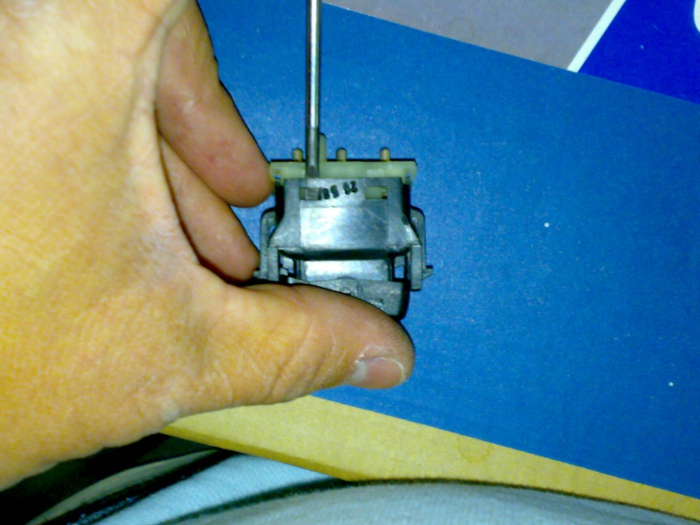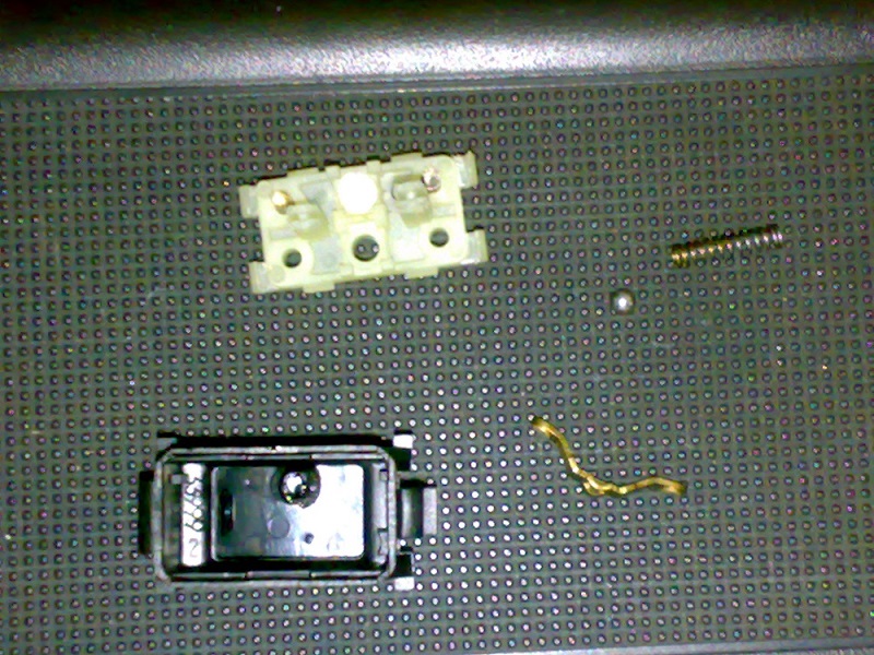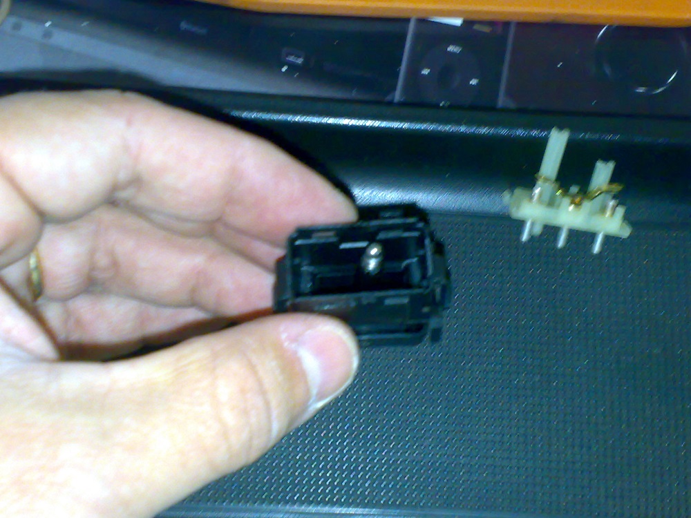 10) Adesso bisogna smontare l'interruttore. Avendo scollegato due connettori avrete più agio nel muovere un po' la console. Sempre con il cacciavitino piatto e MOLTA delicatezza, bisogna infilare il cacciavite nel punto di aggancio superiore dell'interruttore e spingere un po' per sganciarlo. Quando si vede si capisce. Purtroppo, anche qui, una foto era impossibile. Il risultato è che si ha l'interruttore in mano.