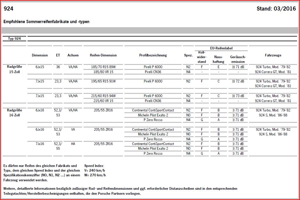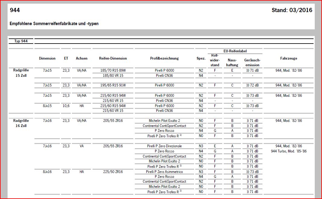 Ti posto stralcio dei pneumatici dichiarati da Porsche per 944: p.s. neanche io sono un guru Io troverei e monterei i 16", le cui gomme sono ancora in commercio a prezzi normali
