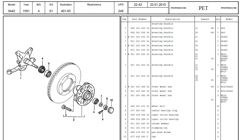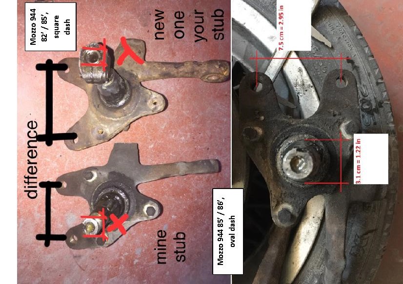 Nel ripristinare la mia 944 mi sono imbattuto in un problema al mozzo ruota (e poi, di riflesso, anche al braccetto della ruota...ma questo è un altro discorso). Così, per stare sicuro essendo il mozzo di una 944 una parte importantissima, mi sono messo alla ricerca del pezzo di ricambio adatto e ho avuto un po' di problemi nel trovare il componente giusto, anche in virtù del fatto che non ho trovato codici di riferimento pressofusi nel pezzo. Da qui le mie ricerche che magari potranno essere di aiuto ad altri. I mozzi delle nostre 944 si differenziano in tre modelli: 1 - modello dal 82' alla metà 85' (square dash) 2 - modello dalla metà 85' alla metà 86' (prime oval dash, quelle con ET basso) 3 - modello da metà 86' a fine produzione. Le differenze tra il primo modello (che monta sostanzialmente il mozzo delle 924) ed il secondo, che si limita solo alle prime oval dash, è enorme: - diverso interasse dei fori delle pinze freno - diversa dimensione del perno ruota, sul quale di aggancia il cuscinetto - diverse le dimensioni del braccetto di attacco ai tiranti dello sterzo - La flagia di attacco delle sospensioni è uguale. Nella foto vedete queste differenze (illustrate poi da me al venditore inglese che mi aveva inviato un mozzo sbagliato...) con le misure di un mozzo di secondo tipo Il secondo modello, da quello poi installato fino a fine produzione, ha misure leggermente diverse da quest'ultimo per adattarsi ai nuovi braccetti con ET alto. Tali differenze, però, non permettono l'installazione di questo sulle prime oval dash.