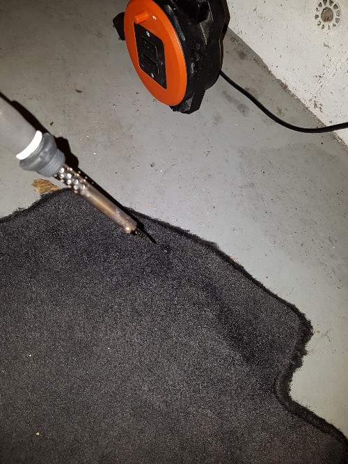 Si segna ora il punto di fissaggio del tappetino e si fa un foro con il saldatore. Qualcuno storcerà il naso a bucare un tappetino Porsche, ma il lavoro risulta praticamente invisibile. Il saldatore scioglie il tappetino e rende il foro poco visibile e rifinito anche senza cucitura.