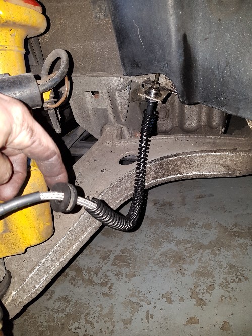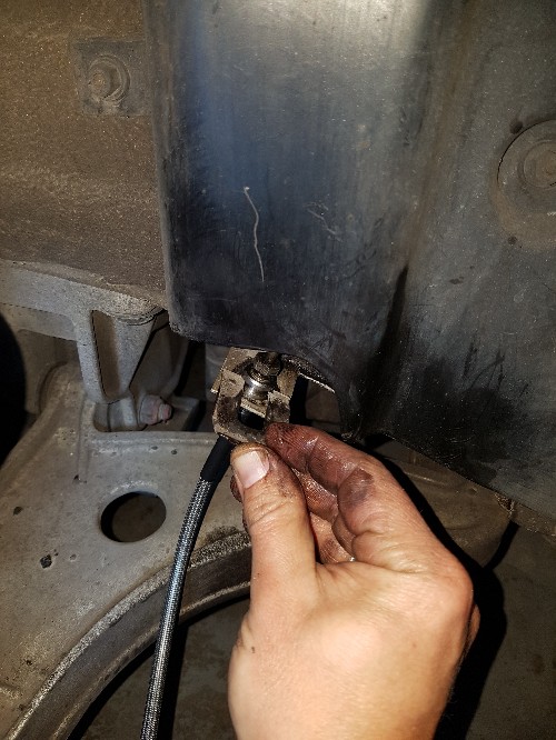 Tolta la ruota si parte a lavorare sul tubo lato vettura. Prima cosa bisogna rimuovere la clip di fissaggio del tubo.