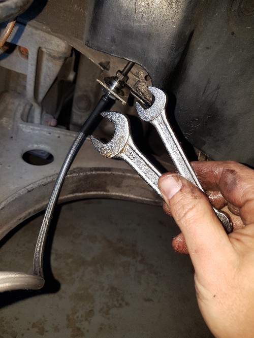 A differenza dell'anteriore, qui, per entrambe gli attacchi, serve lavorare con le due chiavi da 11" e 17" Dopo aver montato il tubo in treccia si riposiziona il cavo del sensore ABS che era stato sfilato dalla sede per comodità