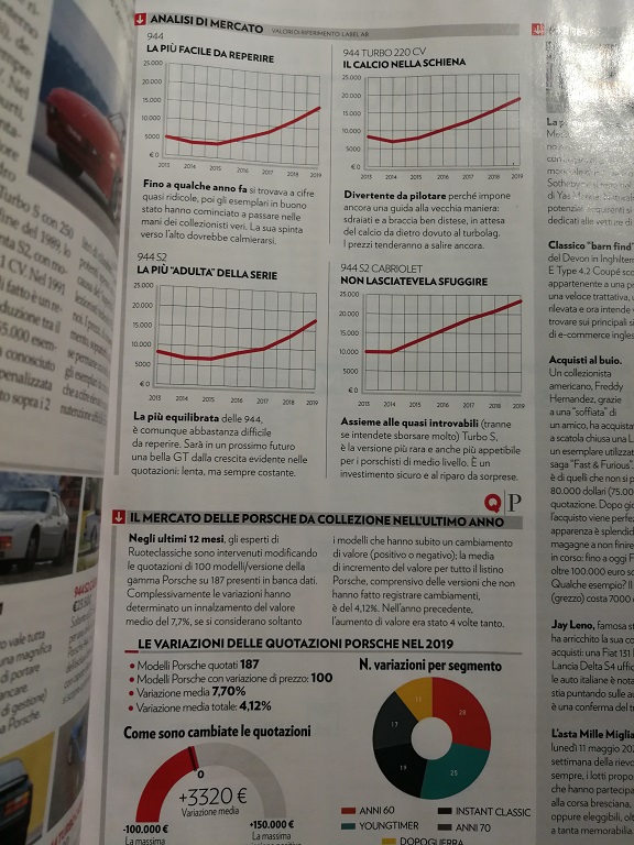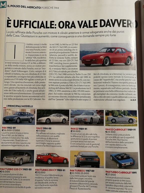per lungo tempo la 914 (la ho quindi la mia non è una critica ma solo una constatazione) è stata considerata più Porsche delle 924/944. Ancora adesso fior di porschisti parlando di 944 menzionano il motore Audi. Soltanto guidandola la apprezzano, anche se alla mia 2.5 del 1988 mancano almeno una ventina di cavalli perchè i 160 sono pochi. Trovo le quotazioni odierne adeguate in quanto -a mio giudizio- il riferimento va fatto con la coeva Alfa Romeo GTV, solo che questa a parità di cilindrata ha un pregevole 6 cilindri. Comunque in mezzo a tante 911 d'epoca la 944 si difende sia da ferma per la sua aggressiva linea, che in movimento passandole e distanziandole sul misto senza neanche guidare con il coltello tra i denti. Sono contento dell'articolo per l'auto merita di essere conosciuta come una grande sportiva, equilibrata e divertente, utile anche per fare la spesa con il suo portellone ed i sedili abbattibili. Però la 911, anche se più lenta, è più divertente da guidare safety fast