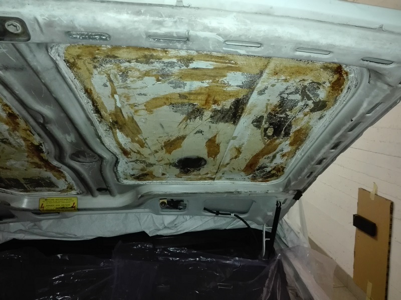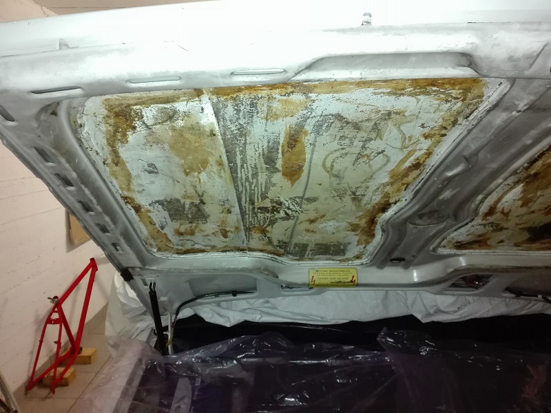 Avrei consigliato smontaggio del cofano, cavalletti, e tanichetta di diluente. Il diluente non toglie la vernice, la opacizza, ma data la zona , e che bisognerebbe rimontare il fonoassorbente, va bene. A patto di non lasciarlo a mollo per troppo tempo.. Sabbiare MAI ! NEIN NEIN NEIN !!!!! Non c'è cosa peggiore, oltretutto con tutti gli scatolati con dentro l'espanso, la ruggine non se ne andrà mai più!  |