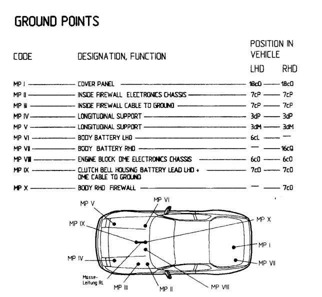 Per prima cosa controlla e pulisci tutte le masse. Stacchi la batteria e cominci a pulirle tutte: sviti, pulisci il connettore, pulisci il punto di contatto, puoi mettere del grasso conduttivo protettivo, riavviti. Sono nel vano motore, una mi pare sia sulla campana della frizione e una nel baule. Ti riporto lo schema qui sotto (occhio che due sono solo per le auto con guida destra RHD). Se poi hai ancora problemi passi a indagare (meglio far indagare) la strumentazione. A.