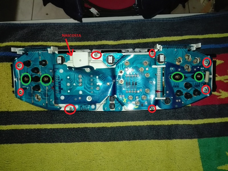 Ciao, da un paio di mesi, la spia dell'alternatore non si accendeva più (con spia allarme generale che restava accesa). In conseguenza di ciò, nonostante la resistenza in parallelo alla lampadina, fino alla prima accelerata a 3.000 rpm, l'alternatore non iniziava a fare il suo dovere. Niente di grave, ma una seccatura. In luglio ho ordinato 3 lampadine per procedere alla sostituzione di quella in oggetto, di quella della benzina (che non ha mai funzionato da quando ho l'auto) e una di scorta e oggi mi sono messo al lavoro per sistemare questa cosa. Disclaimer: questo scritto descrive come ho eseguito il lavoro sulla mia macchina. Non mi assumo la responsabilità di danni derivanti dall'esecuzione delle operazioni descritte sui propri veicoli. ATTREZZI NECESSARI Cacciavite a croce lungo Cacciavite a croce corto Bussola da 7 mm Qualche attrezzo da dentista può aiutare TEMPO RICHIESTO: 1,5-2 ore (se avete già provato a rimuovere la strumentazione, ci vuole qualcosa meno) PARTI NECESSARIE Lampadine (quante ne servono) delle spie strumenti: codice OEM 928 641 983 00 COSTO 5 € per ogni lampadine. Comprate in CP perché introvabili in internet in Italia o recuperabili all'estero a costi simili con i più le spese di spedizione. VEICOLI DI PERTINENZA: 944 seconda serie, 968 ESECUZIONE Rimuovete la strumentazione (qui un link a un altro post dove c'è spiegata la procedura passo passo) http://www.porschemania.it/discus/messages/6/110422.html?1472043407 Fatto questo appoggiate la strumentazione a faccia in giù su un panno morbido per non danneggiare la plastica trasparente Dovrete rimuovere le 9 viti segnate in rosso e i 4 dadi (con rondella elastica sottostante) segnati in verde usando la bussola da 7 mm
