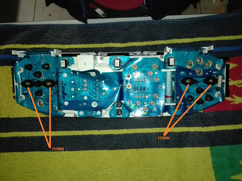 Rimosse viti, dadi e rondelle, mettete tutto al sicuro in un contenitore e rimuovete con delicatezza i 4 connettori/fermi (evidenziati in arancione nella foto sotto) che tengono in posizione gli strumenti e portano corrente agli stessi. Se non venissero via a mano, infilate uno strumento sottile sotto, in modo da iniziare a smuoverli, avendo cura di non appoggiarvi a qualche pista del circuito. Io ho usato un attrezzo curvo da dentista.