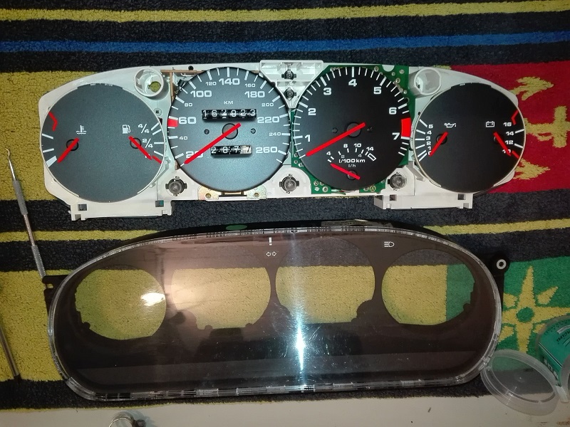 A questo punto, tenendo con le mani tutta la strumentazione (parte davanti trasparente e dietro) ribaltatela e rimuovete la copertura in plastica trasparente (che include il fondo nero). Fate attenzione a non danneggiare le lancette. Vi troverete in questa situazione