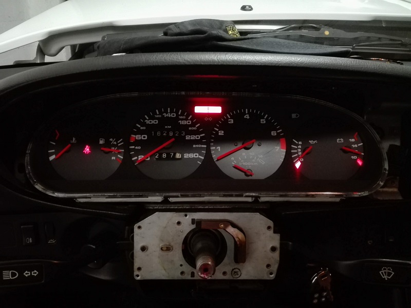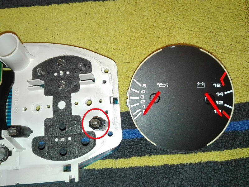 Rimuovete gli strumenti di destra e sinistra (si sfilano semplicemente). Nella foto seguente vedete lo strumento di destra rimosso dalla sua sede e la lampadina non funzionante evidenziata in rosso