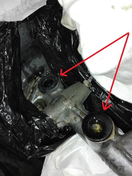 Pulite, con uno straccetto e del brake cleaner il cilindro maestro (dell'olio vi sarà colato di sicuro). Fate attenzione a non contaminare l'olio nel cilindro con polvere, pelucchi e contaminanti in genere. Pulite la vaschetta usando del brake cleaner (in esterno) e rimettetela in sede. Per farlo bisogna fare MOLTA forza, facendo attenzione a non romperla (su RosePassion costa 90€ più spedizione). Fate attenzione a verificare di averla spinta bene in sede. In foto il risultato a metà dello sforzo per rimetterla in sede.