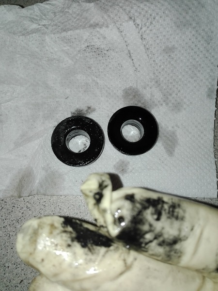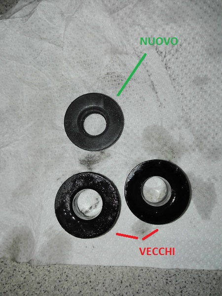 Nel mio caso uno dei due era meno usurato dell'altro. Qui a paragone con uno dei gommini nuovi. Si vede che il diametro del foro è più piccolo e il materiale, al tatto, era più rigido,