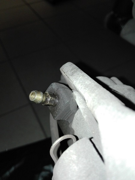 Adesso il lavoro si sposta sulle pinze dei freni. La sequenza, per le auto con guida a sinistra, è: posteriore destra, posteriore sinistra, anteriore destra, anteriore sinistra. Le valvoline posteriori hanno bisogno di chiavi da 7 mm, quelle anteriori da 8 (in foto una posteriore)