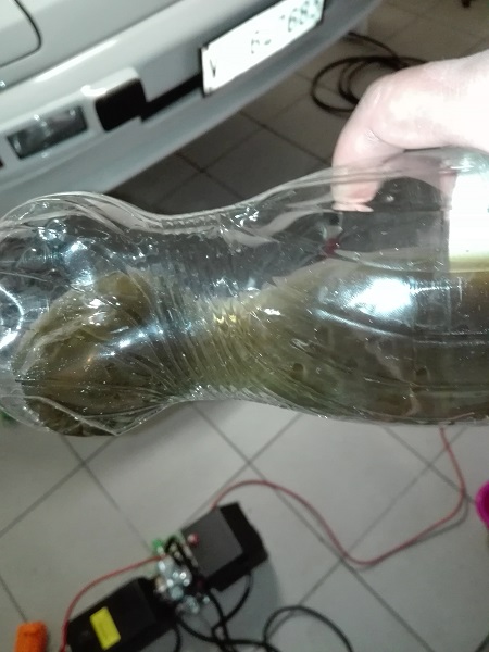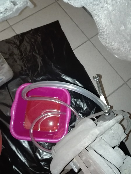 Pulite tutta tutta la zona, magari sostituite il cellphane. Collegate il "maialino" e mettete in pressione l'impianto (0,6 bar, max 1 bar) solo con aria nel dispositivo. Verificate che non ci siano perdite lasciandolo lì 5 minuti.