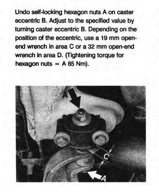 Ok. Ho dato un spolverata ai manuali. Avevo sempre toccato il camber, mai il caster. La campanatura è il camber, mentre tu stai guardando la regolazione del caster. Qui c'è gente che ne sa molto più di me, ma di solito per le regolazioni si tocca la campanatura e la convergenza. |