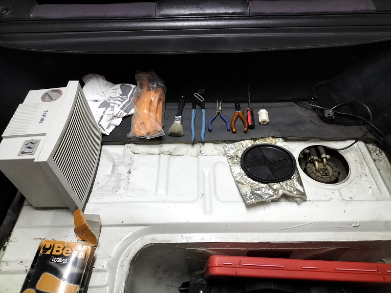 Approfittando delle giornate piovose continuo con alcuni lavoretti lasciati in sospeso troppo a lungo. Da un po' di tempo, andando in giro con l'auto, sentivo odore di benzina nell'abitacolo e, la fonte più probabile, è la guarnizione del galleggiante che si è deteriorata. Disclaimer: questo scritto descrive come ho eseguito il lavoro sulla mia macchina. Non mi assumo la responsabilità di danni derivanti dall'esecuzione delle operazioni descritte sui propri veicoli. ATTREZZI E MATERIALI DI LAVORO NECESSARI Cacciavite piatto Bussola da 5,5 mm "Pappagallo" o altro attrezzo atto a svitare la ghiera che fissa il galleggiante al serbatoio Qualsiasi attrezzo adatto ad aiutarsi a sfilare i tubi di gomma dalla loro sede Un contenitore resistente alla benzina Stracci Pulitore di contatti Pulitore di carburatori/corpi farfallati TEMPO RICHIESTO: 1 ora DIFFICOLTA': semplice PARTI NECESSARIE Guarnizione: 944 201 327 00 COSTO Guarnizione: 7 euro circa, in CP VEICOLI DI PERTINENZA PER LA PROCEDURA: tutte dalla 944 MK II (02/1985). Per le 944 MK I, la procedura è leggermente diversa perché il galleggiante è diverso, non c'è il connettore ma tre fast-on, la guarnizione è diversa e il galleggiante è fissato con delle viti e non con la ghiera. ATTENZIONE: QUI SI APRE IL SERBATOIO DELLA BENZINA!!!! OPERARE IN UN LUOGO BEN VENTILATO O FARE IN MODO DI RENDERLO TALE. TENERE UN ESTINTORE A PORTATA DI MANO, PRONTO ALL'USO. EVITARE SCINTILLE!!!! PRESTARE MASSIMA ATTENZIONE!!!!!!!!! ESECUZIONE Rimuovere il tappeto dal baule. Aprire per un momento il tappo di rifornimento carburante al fine di rimuovere eventuali differenze di pressione. Non potendo operare in un luogo ben ventilato, mi sono attrezzato con una stufetta IMPOSTATA SU ARIA FREDDA e attivata PRIMA di aprire il serbatoio.