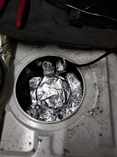 Qui si può scegliere se iniziare ad allentare la ghiera e poi rimuovere i tubi o viceversa. Dopo aver fatto il lavoro, suggerisco di allentare appena la ghiera, in modo che il galleggiante possa ruotare nella sua sede, rimuovere i tubi e poi svitare la ghiera completamente. Questo perché Porsche è sempre avara di spazio e di margini di materiale per lavorare comodamente. Mettere uno straccio nel pozzetto, prima di rimuovere i tubi, per assorbire eventuali gocce di benzina. Per svitare la ghiera, usare un "pappagallo" o attrezzo simile per afferrarla ai due lati e poterla ruotare. Le fascette possono essere lasciate sui tubi o portate sul galleggiante. Una volta rimossa la ghiera, il galleggiante può essere estratto. ATTENZIONE: in esso c'è della benzina che va lasciata scolare attraverso un piccolo forellino laterale. Se si estrae il galleggiante senza fare questa operazione vi troverete della benzina sparsa nel pozzetto (o sullo straccio precedentemente posizionato nel pozzetto). Estratto, lentamente, il galleggiante (dopo lo scolo) metterlo nel contenitore resistente alla benzina: qualche residuo di carburante può ancora colare. Per sicurezza, ho messo dell'alluminio sull'imbocco dei tubi e sopra la sede del galleggiante, così da evitare cadute accidentali di oggetti o altro nel serbatoio.
