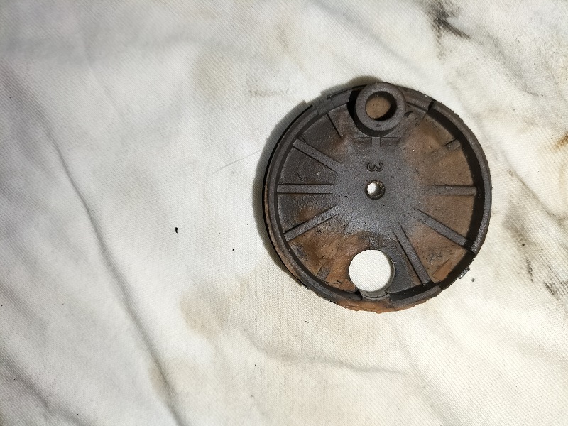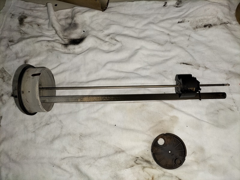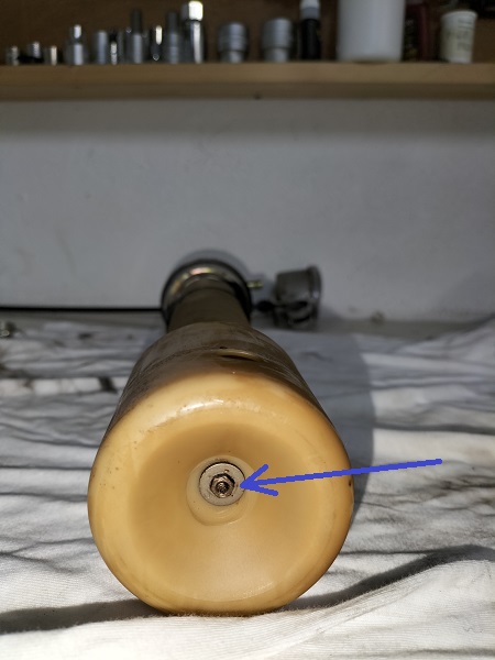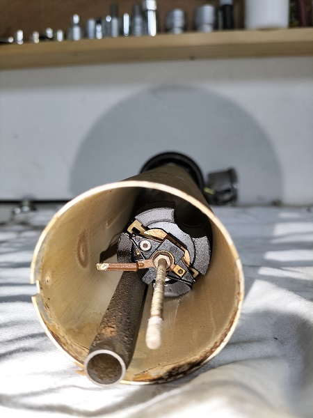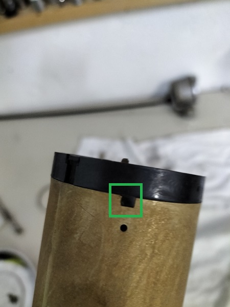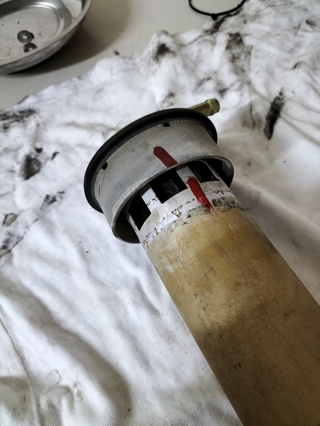 Sul banco da lavoro posizionare il galleggiante. Vediamo che una guarnizione che dovrebbe esserci sulla parte superiore è disintegrata e che qualche "pasticciatore" ha tentato di porre rimedio in qualche modo.