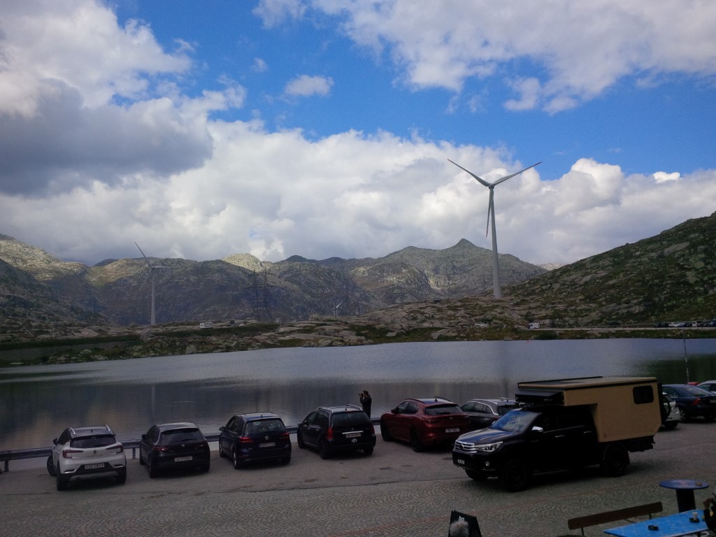 Giunti sul passo ci fermiamo per il pranzo... il panorama è deturpato dalle stramaledette pale eoliche...va bene essere avanti con le rinnovabili ma certe volte gli svizzeri sconfinano nell'iperbole, vedi anche l'amore per il cemento grezzo che hanno sparso a profusione negli anni '70 e '80.