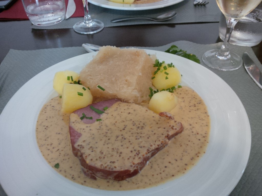 Ovviamente il materiale esposto è (perfettamente coerente con lo sciovinismo nazionale) TUTTO francese, come se la ferrovia l'avessero inventata loro. C'è anche da dire che l'ingegneria ferroviaria francese è stata ai vertici in Europa per parecchi decenni, introducendo mezzi d'avanguardia come le automotrici Bugatti (esposte), i turbotreni o lo stesso TGV, che oltrepassò i 574 km/h nel 2007. Il pranzo di commiato ha luogo all'interno del museo, nel simpatico ristorante "Le Mistral" in omaggio ad uno dei treni più iconici delle SNCF, il famoso convoglio Parigi-Marsiglia-Nizza. Finalmente, dopo una serie di piatti di alta cucina, abbiamo un assaggio di quella tradizionale alsaziana: spalla di maiale affumicata con una splendida salsa alla senape in grani, patate e la straordinaria "choucrute": crauti stufati nel Riesling.