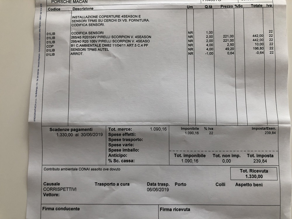 Scusate, volevo chiedere a chi a già fatto questo intervento se i prezzi sono onesti, sto per sostituire tutte le pastiglie dei freni, anteriori e posteriori alla 2.0 con 40.000km. Per comodità andrei dal meccanico sotto casa che è un po' quello di fiducia ma non sono convintissimo della convenienza. Allora stando al preventivo, in totale costo iva e manodopera compresa siamo sui 430 euro. Anteriori 173 + 22 sensori. Posteriori 108 + 17 i sensori. Più ci saranno un paio di ore di lavoro mi ha detto.(pastiglie uguali alle originali marca TEXTAR) Visto che ci siamo, ho sostituito i 4 pneumatici con dei Pirelli Scorpion Verde All Season anteriori 265/45/20 104V, posteriori 295/40/20 106V. Totale montaggio e iva compresa euro 1.090 più circa 200 euro per i 4 sensori TPMS. A parte prezzi Amazon o ebay, secondo voi un'officina autorizzata Alfa e Fiat, mi pare siamo sui 45/47 euro l'ora, più ricarico sui materiali, compreso lo sconto finale, ci siamo come prezzi? (Messaggio modificato da marco_r il 03 giugno 2019) |