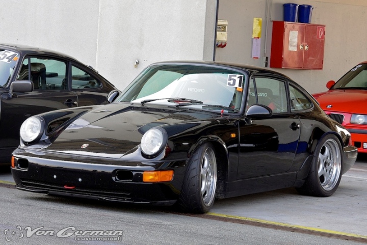 Ti consiglio di cercare 4 Speedline in magnesio. Per quanto riguarda i 18" (che ho dovuto usare poichè le Pirelli slick da 17" non sono più fornite), la misura giusta per l'anteriore è 8x18 ET 52 (li trovi facilmente, sono gli Speedline scomponibili della turbo 3.6). Il problema è al posteriore, in quanto la misura corretta da 18" (quella che usavano nel 1993 sui 964 Cup) era 9,5x18 ET 47. Questi ultimi, specifici per la 964 Cup, sono praticamente introvabili. Io monto dietro gli Speedline scomponibili da 10x18 ET 61 (quelli posteriori dal Turbo 3.6), ma con tali cerchi devi montare un distanziale da 8 mm, altrimenti la gomma tocca dentro, ma per fare ciò devi anche cambiare le colonnette, e montarne delle più lunghe (le originali vanno bene solo con distanziali fino a 5 mm).