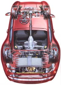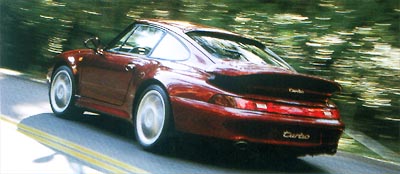 di inedito design. Venne equipaggiata anche con nuovi cerchi in lega da 18 pollici denominati 'Technologie-Rad' (design esclusivo Porsche), studiati appositamente per migliorare il raffreddamento dei freni, e dotati di gomme ant. 8J 225/40ZR e post. 10J 285/30ZR. Il sistema frenante fu ulteriormente perfezionato, mantenendo i dischi da 322 mm, e adottando il sistema ABS versione 5 che permetteva di fermare l'autovettura da 100 Km/h a 0 in 2,61 sec. Il motore M64/60 di 3.6 litri (due valvole ed una candela per cilindro) adottava ora una doppia sovralimentazione mediante due turbocompressori KKK K16, ognuno con valvola waste-gate integrata, e due intercooler aria-aria; la conformazione con i due piccoli turbo permetteva di avere una coppia di 450 Nm già disponibile a 2.500 giri/min. offrendo quindi un'elasticità di marcia mai vista in un'auto sovralimentata. Venne adottato il sistema digitale Bosch Motronic M5.2 per il controllo elettronico del motore e cio' permise anche di alzare il livello di compressione fino a 8,0:1 La potenza massima era di 408 CV a 5.750 giri con una coppia di 540 Nm a 4.500 giri/min. Quattro sensori combinati con il sistema elettronico OBD2 (On Board Diagnostic) garantivano all'auto di soddisfare ampiamente le severe leggi USA ed Europee anti-inquinamento. Fu utilizzato il nuovo cambio G64/51 a sei rapporti, in congiunzione con il sistema a quattro ruote motrici della della 993 Carrera 4, che ripartiva la trazione con un rapporto 20/80 Un differenziale autobloccante (25%-40%) connesso con il sistema ABD garantiva un'ottima aderenza ed entrava in azione a partire dai 70 Km/h Le prestazioni dichiarate furono di 290 Km/h di velocità massima ed un'accelerazione da 0 a 100 Km/h di 4,5 secondi. La produzione cessò nel Luglio 1998 |